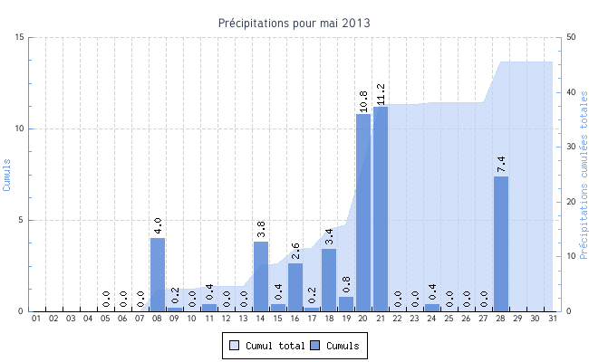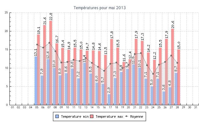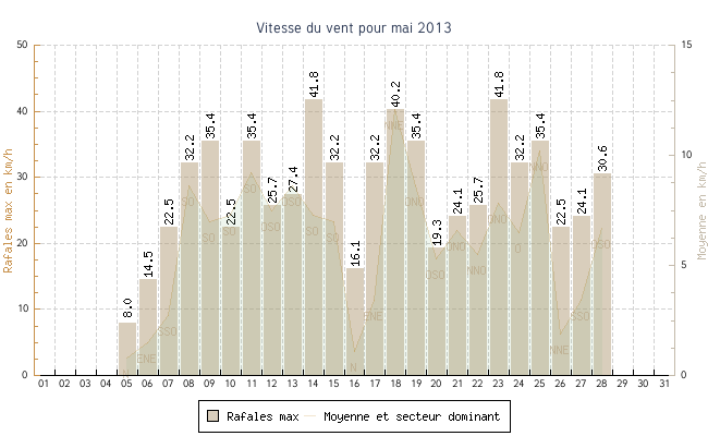 | 05 | 13.1 °C | 19.1 °C | 16.3 °C | 0.8 km/h (8.0 km/h) | N |